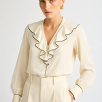 The Belle Long Sleeve Blouse brings graceful detail and all-day comfort into one timeless piece. Designed with the same romantic ruffle accents as the original, this version features full-length sleeves for a more refined and versatile look.