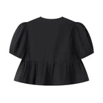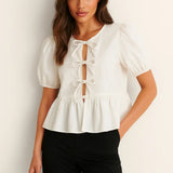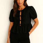 Gemaakt van een zachte, ademende stof met een subtiele glans, tilt hij elke outfit naar een hoger niveau – of je je nu netjes aankleedt voor een avondje uit of een vleugje verfijning toevoegt aan je dagelijkse look. Het gestructureerde silhouet flatteert de taille, terwijl de pofmouwen een prachtig contrast creëren dat de aandacht trekt.