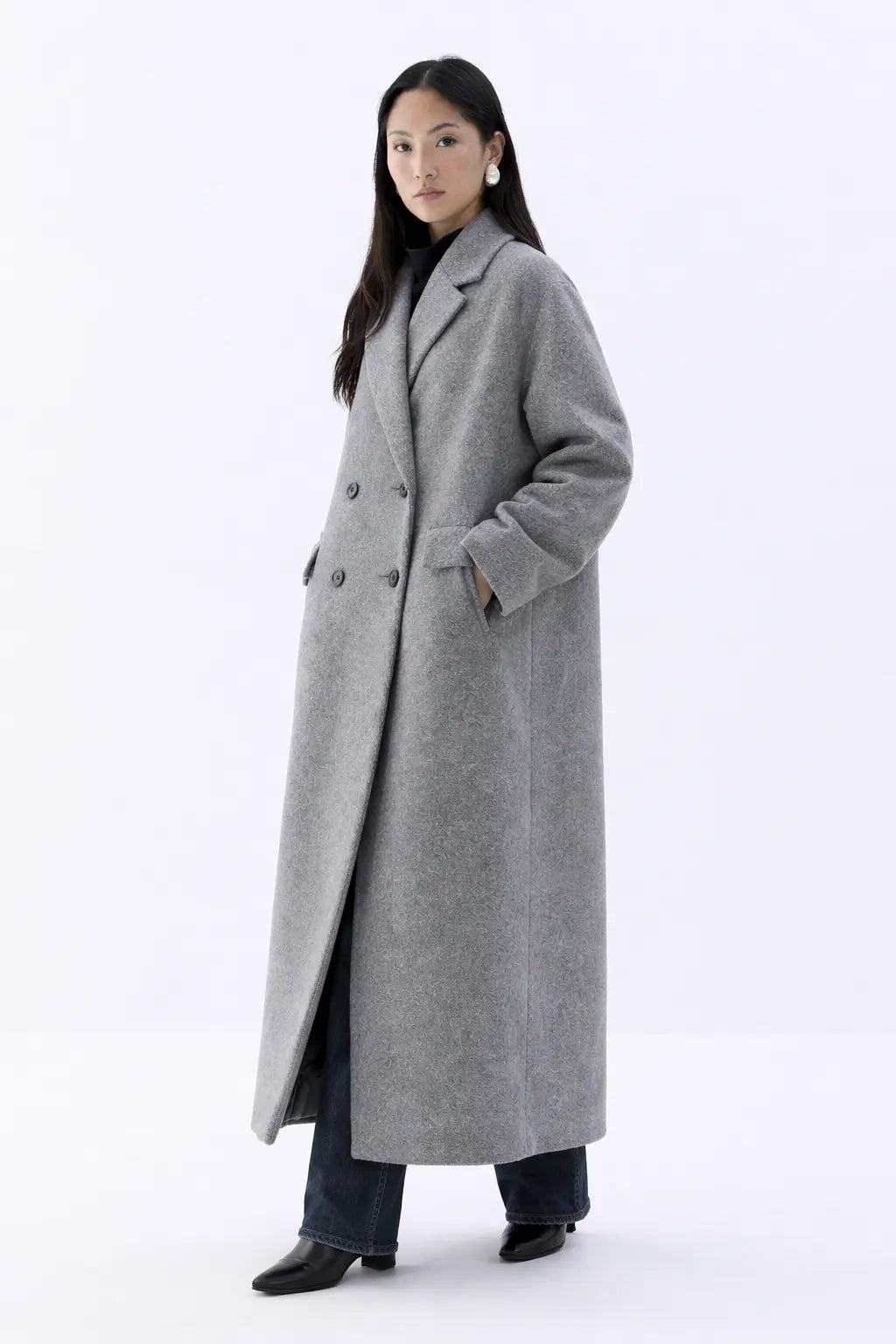 Wrap yourself in sophistication this season with the Corvelle Coat, a long, double-breasted classic crafted for both style and comfort. Designed with a turn-down collar and tailored in a loose fit, it offers a graceful silhouette while keeping you warm through autumn and winter.