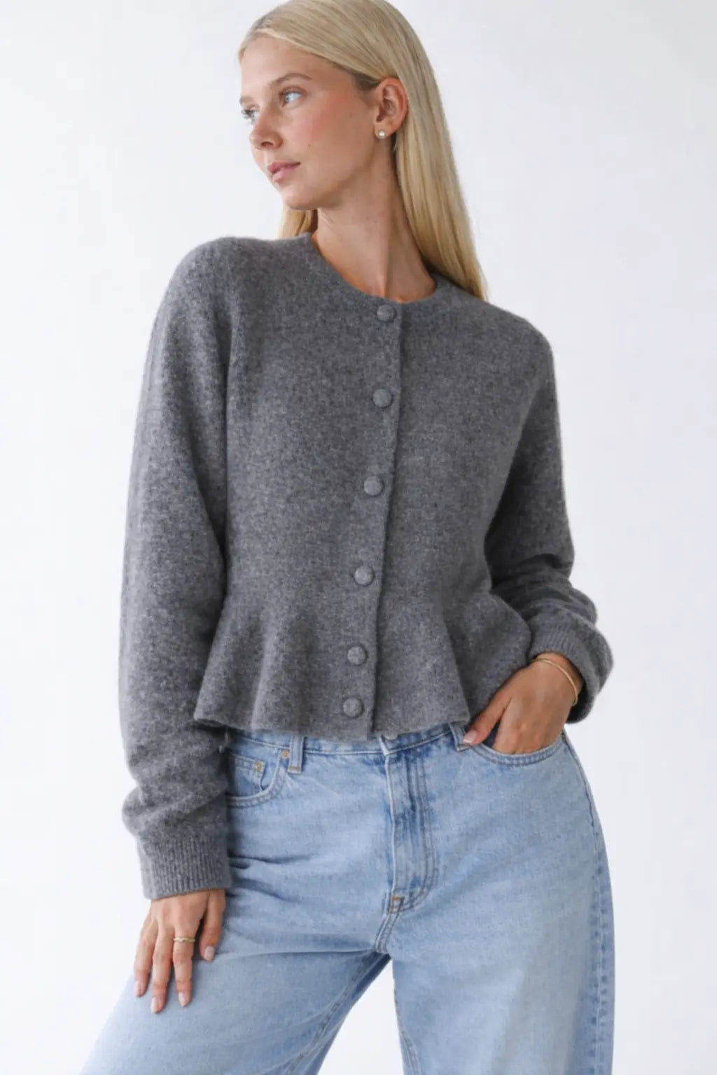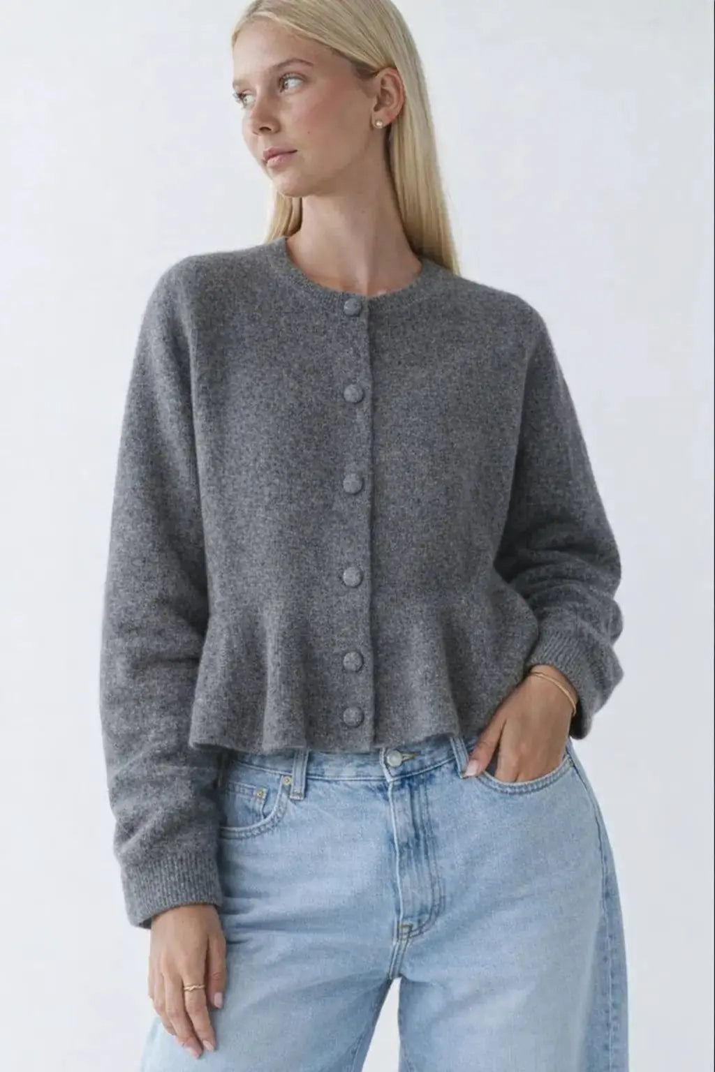 Soft, subtle, and effortlessly feminine — the Camille Volant Cardigan brings gentle texture and timeless style to your wardrobe. Crafted from a plush grey knit, it features delicate grey buttons that blend seamlessly into the fabric for an understated look.