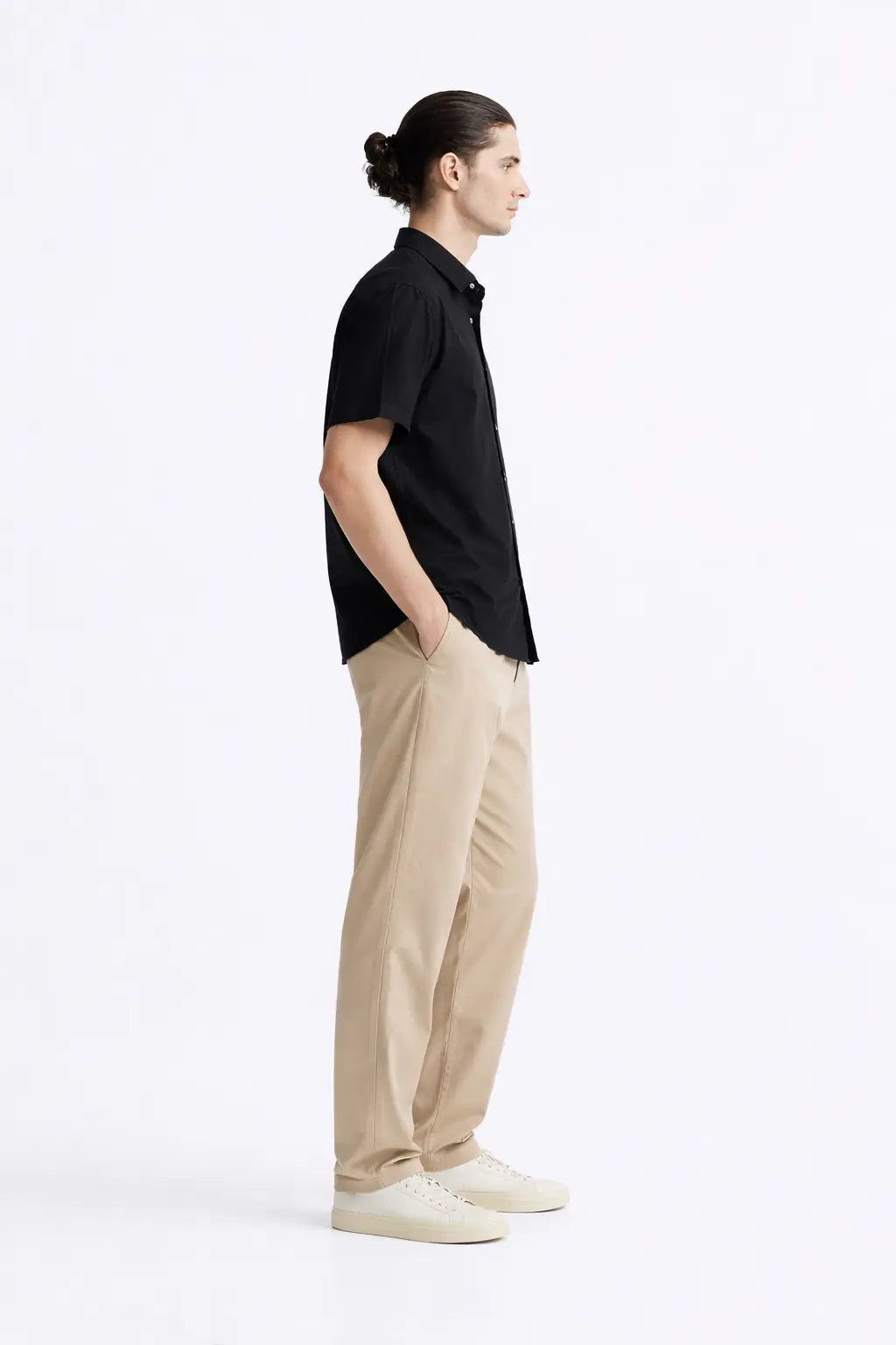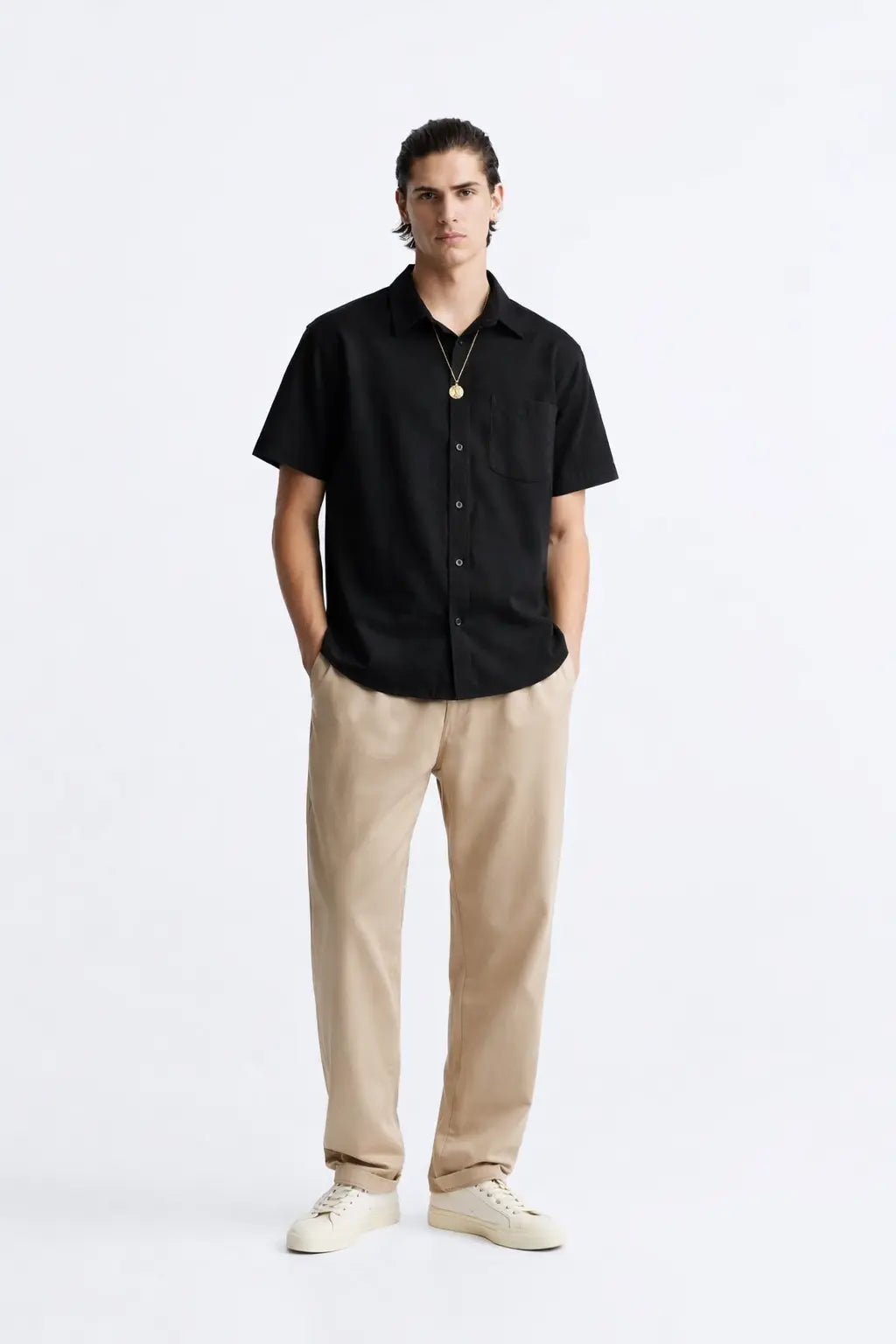 - Linnebyxor - Beige: Lätta och avslappnade byxor är perfekta för en promenad längs stranden eller en avslappnad lunch vid havet.